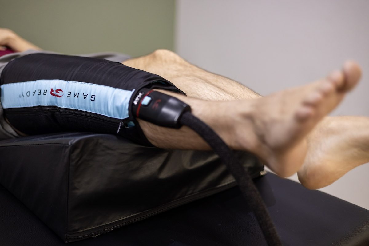 Sessões de liberação miofascial e bota de compressão pneumática para potencializar a recuperação entre treinos.